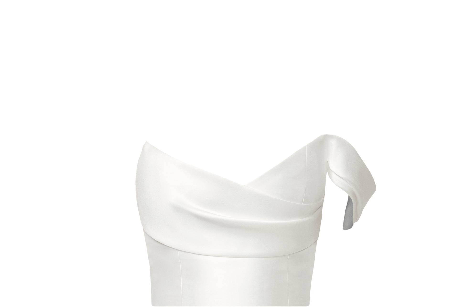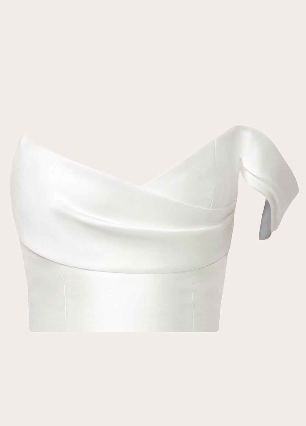 Designed to make a statement, Bianca Mini features a strapless v-neckline and sleek, hand-draped bias front creating an effortlessly polished look, while the off-the-shoulder draped sleeve adds a touch of romance. Made from our lustrous Spanish Mikado, the fully boned bodice provides endless support and structure.