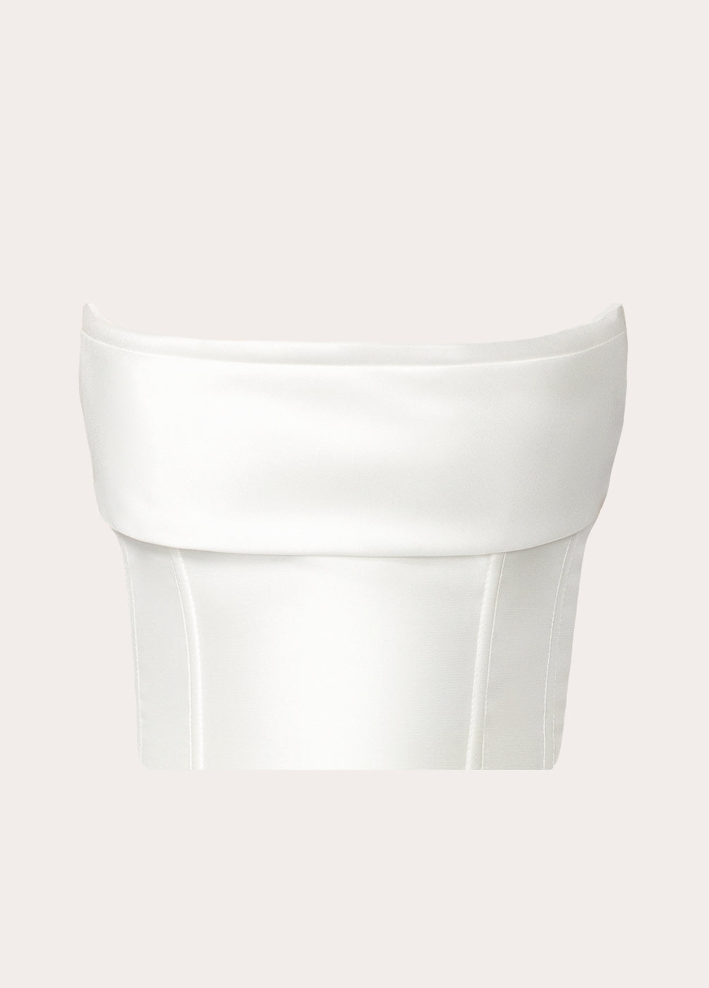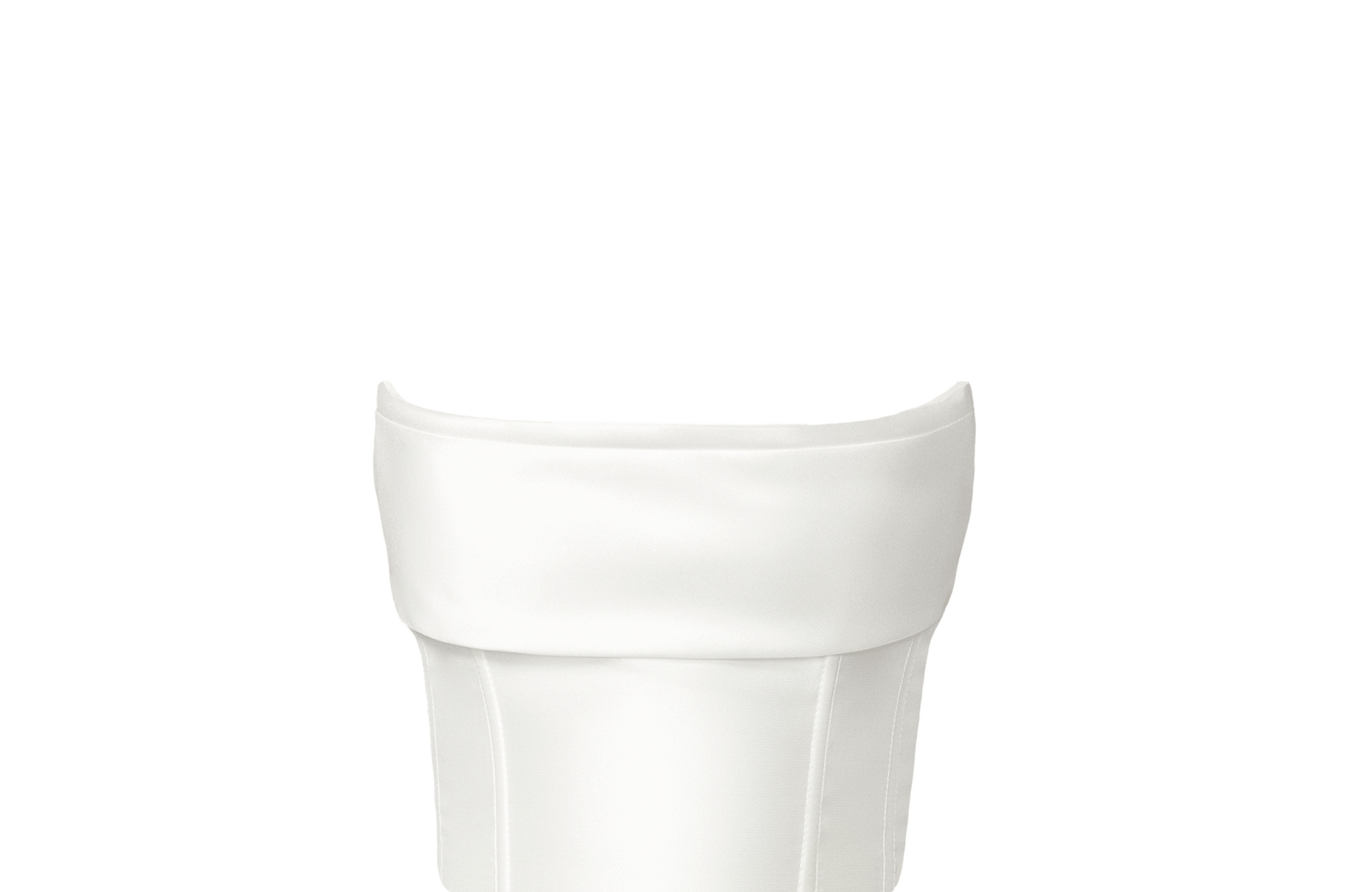 Inez Mini exudes elegance and modern sophistication. The strapless, scooped neckline is beautifully accented by hand-draped bias bands that frame the bust, flattering the figure. Crafted in a lustrous Spanish Mikado, the fully boned bodice with directional boning stitch lines provides structure, support and visual interest.