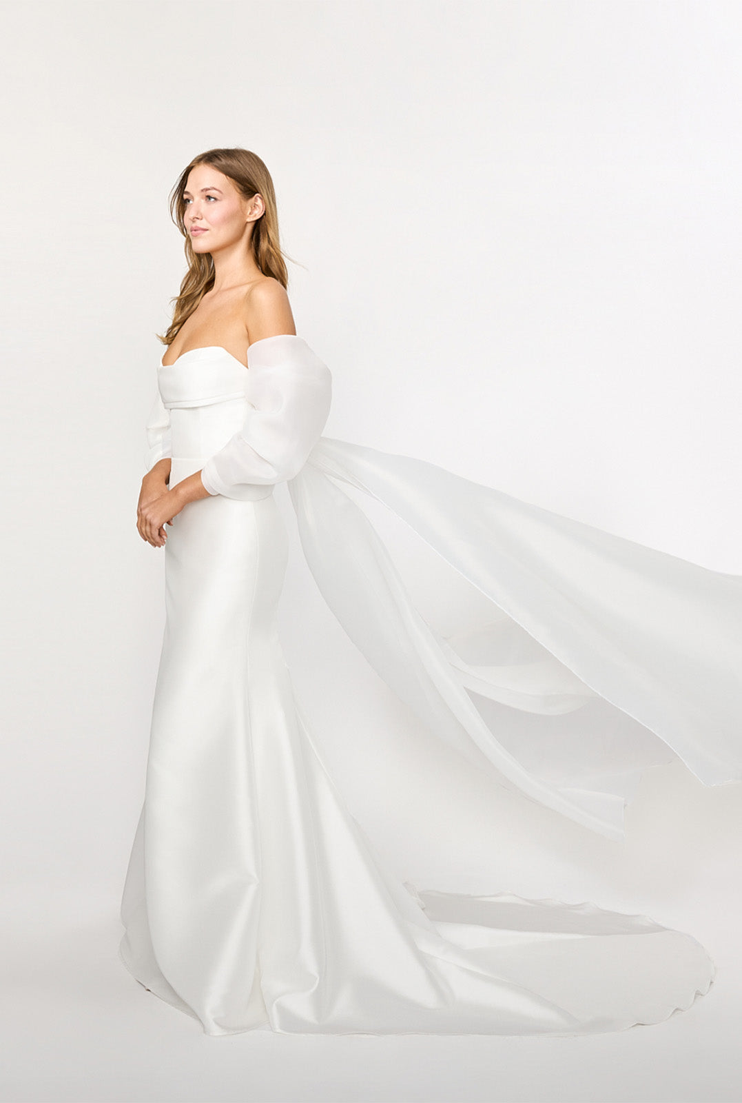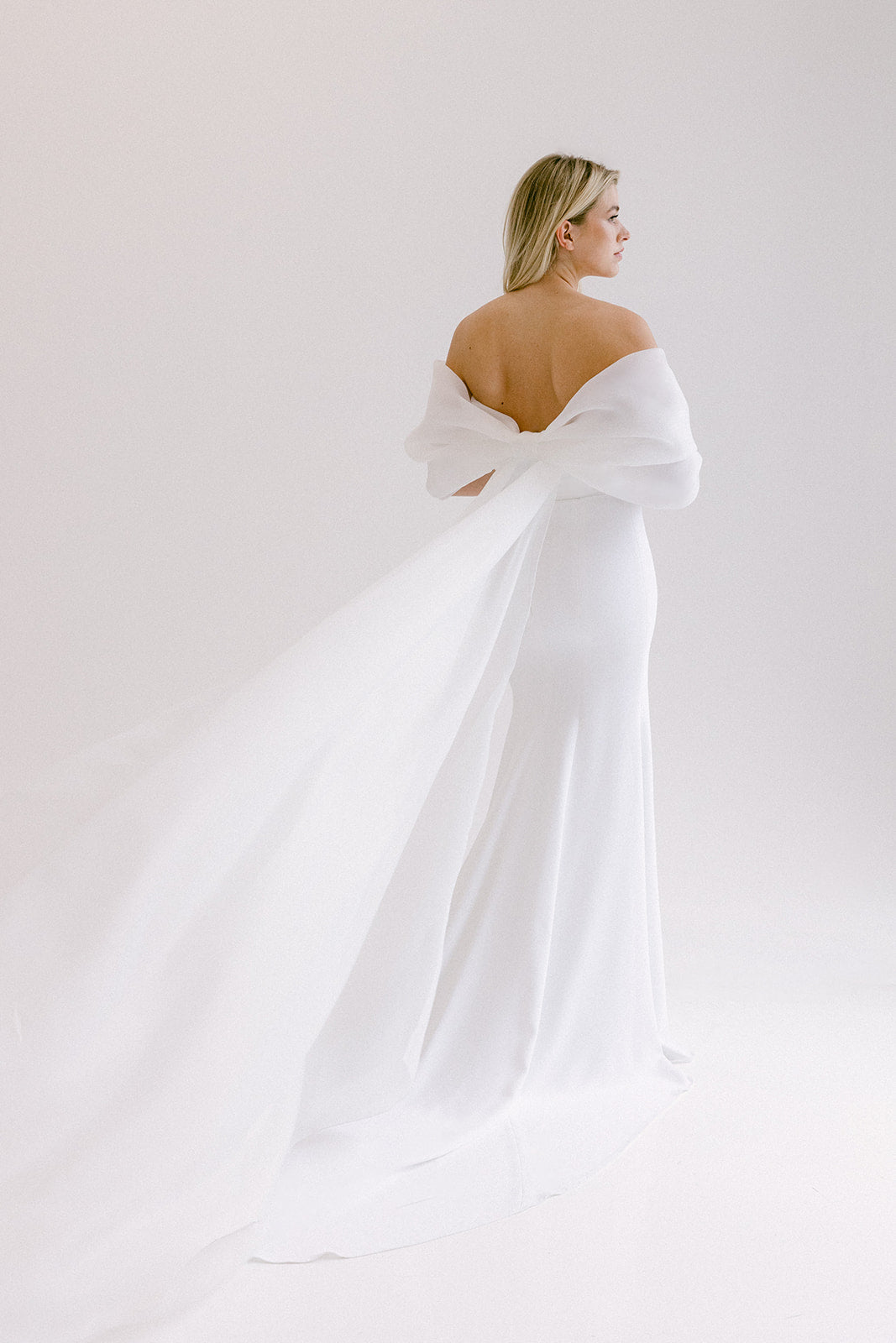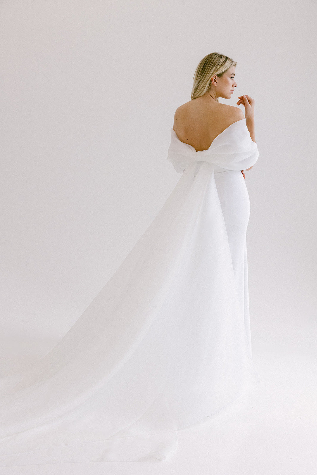 The Valentina Shawl features a soft structured bow with detachable long, flowing tails. Made from luxurious organza, this versatile piece can be worn gracefully over the arms or attached to your dress for a refined look. The removable tails offer two different looks, taking the modern bride seamlessly from ceremony to reception.