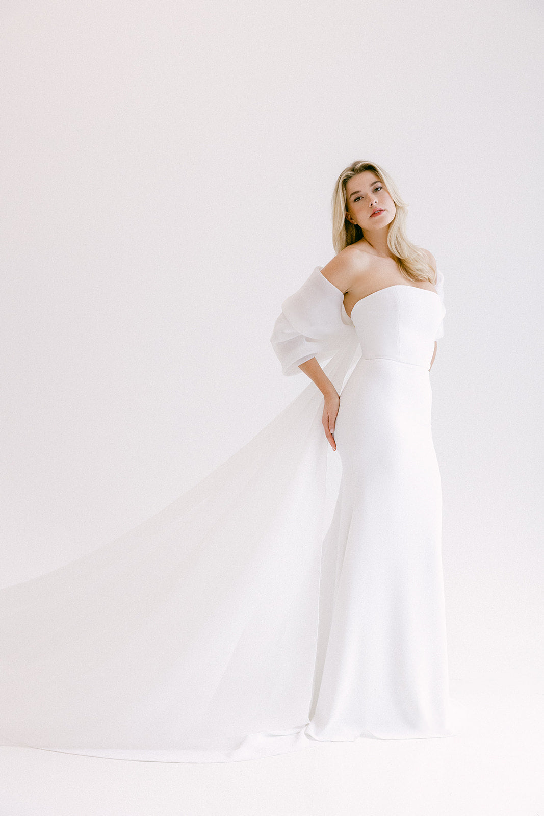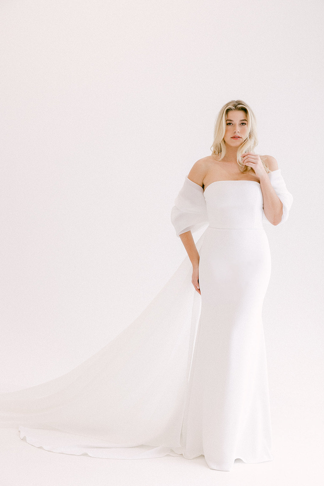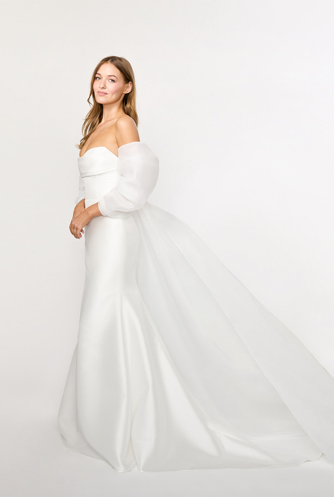 The Valentina Shawl features a soft structured bow with detachable long, flowing tails. Made from luxurious organza, this versatile piece can be worn gracefully over the arms or attached to your dress for a refined look. The removable tails offer two different looks, taking the modern bride seamlessly from ceremony to reception.