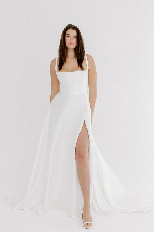 Our gowns are celebrated for their fine quality materials and exquisite craftsmanship. From our figure-hugging signature crepe to the sleek, lustrous mikado, each dress is designed to offer an effortlessly refined look, exceptional support, and an elevated experience that feels uniquely you.